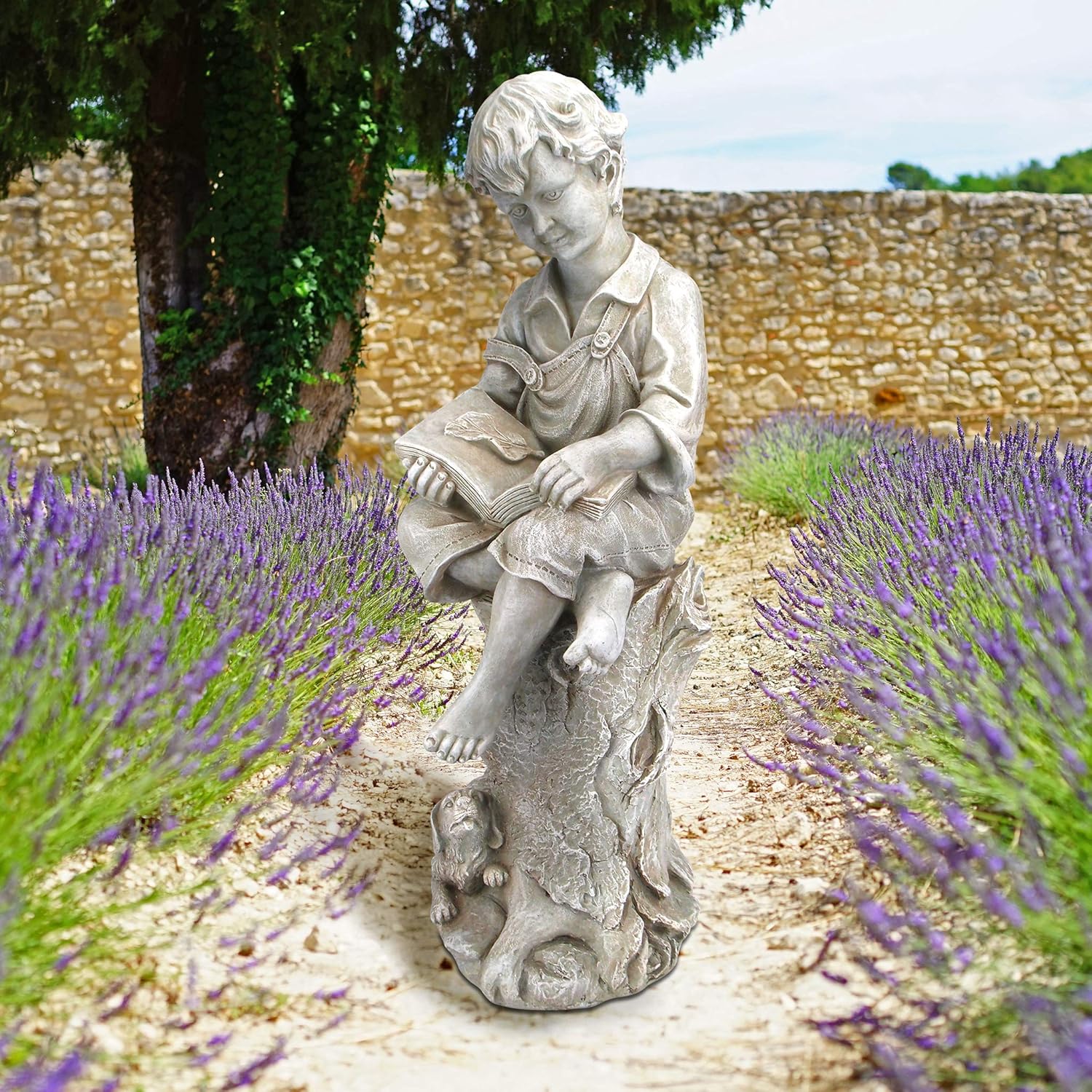 Sitting on top of a tree stump, his puppy curled up at his feet, this young man is deeply engrossed in his book. With bare feet and overalls, this statue of boy reading captures the carefree days of summer.