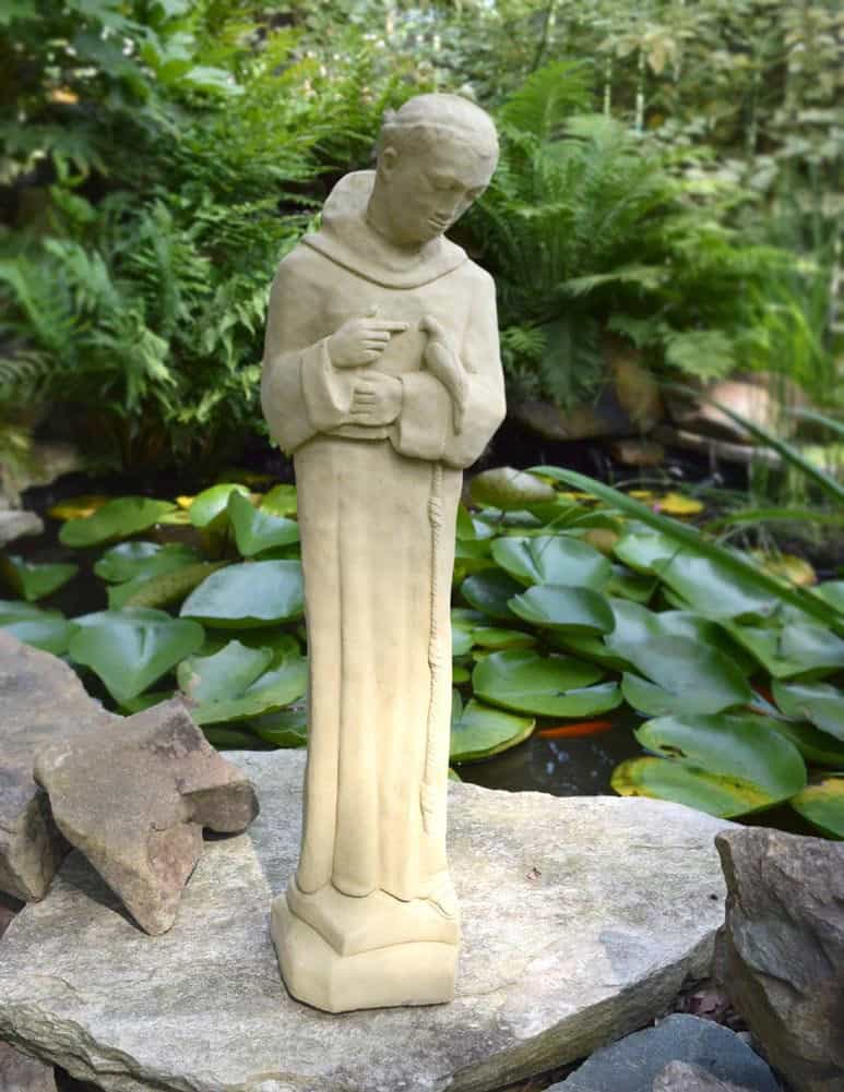 This small solid stone figure portrays St. Francis in a meditative pose with a bird in his hands.